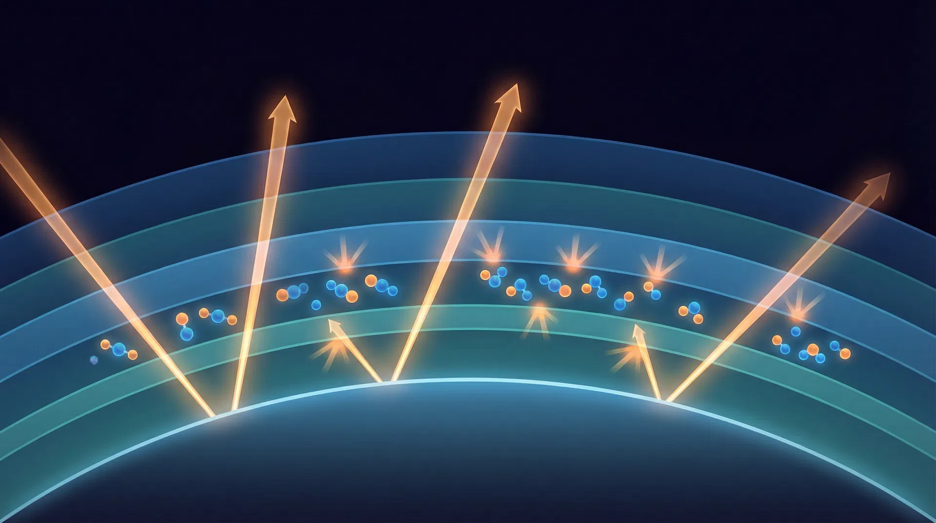 Planck's formula tells us how much heat a solid surface emits. But what happens to that radiation as it travels upward through the atmosphere? The air contains gas molecules (CO₂, water vapour, etc.) that absorb some of that radiation — and then re-emit it in all directions, including back down toward the surface. This is the greenhouse effect.